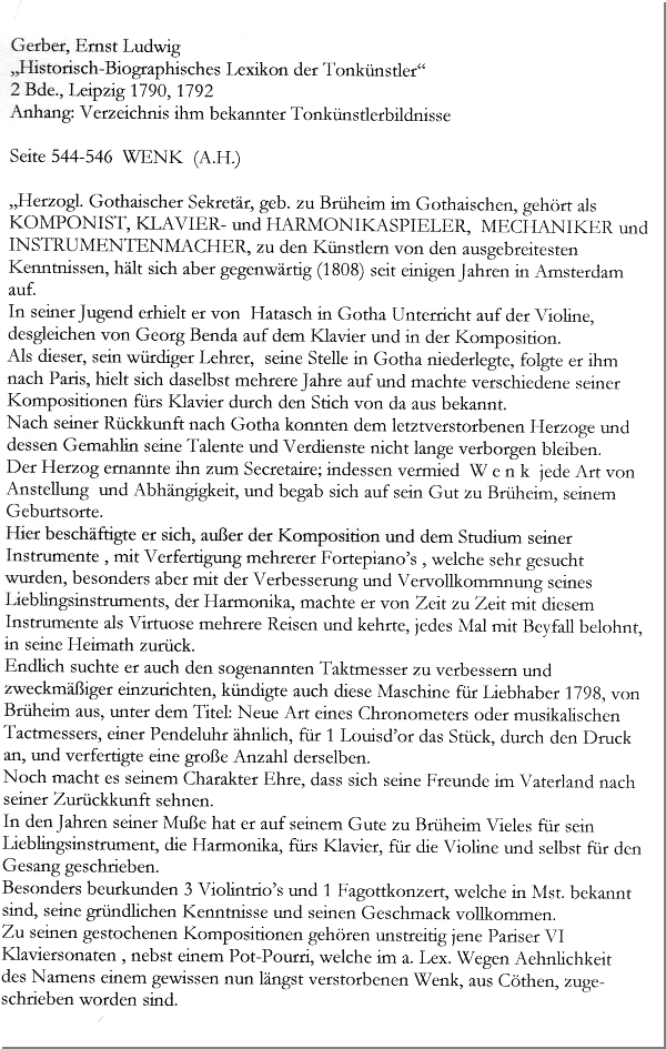 Der Zeitgenosse GERBER beschreibt in seinem Historisch-Biographischen Lexikon der Tonkünstler auf Seite 544, daß „Wenck aber jede Art von Anstellung und Abhängigkeit vermied und fortan freischaffend auf seinem Landgut in Brüheim, seinem Geburtsort lebte. Hier beschäftigte er sich außer mit Komposition und dem Studium seiner Instrumente, mit der Verfertigung mehrerer Fortepianos, welche sehr gefragt waren, besonders aber mit der Verbesserung und der Vervollkommnung seines Lieblingsinstruments, die Glasharmonika. Von Zeit zu Zeit unternahm der mit diesem Instrument als Virtuose mehrere Reisen, u.a. auch nach Holland und kehrte jedes Mal mit Beyfall belohnt, in seine Heimat zurück“.