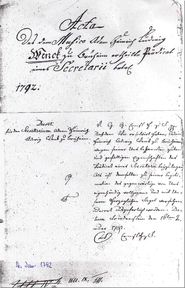 Nachdem wir resolviret haben, Adam Heinrich Ludwig Wenck zu Brüheim wegen seiner uns bekannten guten und gefälligen Eigenschaften das Prädicat eines Secretarii beyzulegen, als ist demselben zu seiner Legitimation das gegenwärtige von uns eigenhändig vollzogene und mit unserem Herzoglichen Siegel versehene Decret ausgefertigt worden. Friedenstein, den 16ten Januar 1792 Ernst Herzog von Sachsen