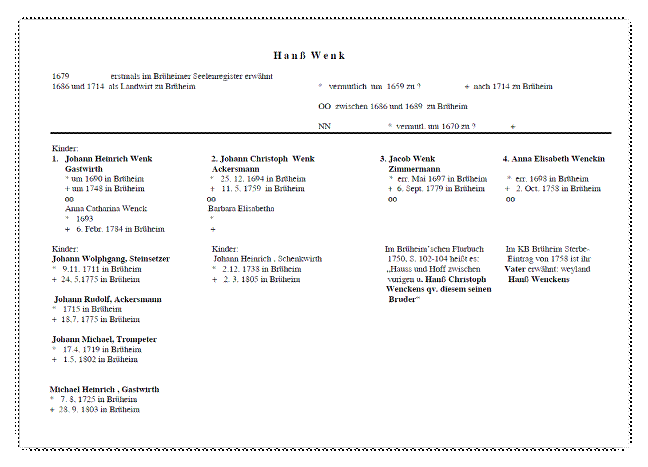 Die vorstehende Stammlinie des Hanß Wenk ist auf der Grundlage der vorher genannten Daten entstanden und hat nur hypothetischen Charakter. . . . So könnte die Lücke geschlossen werden.